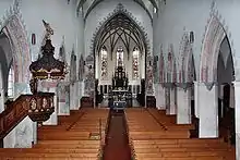 The three-nave basilica, begun in its present form around 1325 and completed around 1500, is the main church of the Protestant-Lutheran church district of Memmingen, a regular place of preaching for the Memmingen dean and the center of one of the city's four Protestant-Lutheran parishes. The basilica, financed by the citizens, was the largest Gothic town church between Lake Constance and the Lech River after its completion.[1] It houses many works of art, including the choir stalls, which are over 500 years old, are among the best late Gothic carvings in southern Germany, and are considered the city's greatest artistic treasure.