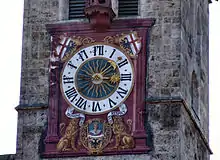 Michael Geiger the Elder exposed the framing again in 1906. During the great tower restoration of 1927 under the Ulm Cathedral master builder Karl Wachter, the iron clock face was removed and the complete plaster was chipped off in the process. Prior to this, the original was removed and a new version was made by the Haugg brothers from Ottobeuren. Since this time, it is no longer possible to speak of a painting by Bernhard Strigel,[13] which had to be renewed again in 1966. Today's condition reflects the representation from 1697. The dial is flanked by two Memmingen city coats of arms at the top left. Two lions hold a cartouche with the imperial double-headed eagle as well as the head of a king as the supreme lord of the free imperial city. The depicted king's head, however, was not recognized as such by the population, but was regarded and venerated as the head of "Saint" Hildegard. This is surprising, since Memmingen already converted to the reformed confession in 1530, and after that the veneration of the saint was practically no longer carried out. The painting became one of the seven Memmingen landmarks. On a banner above the lion heads is the imperial motto: "DOMINE HUMILIA RESPICE" (Lord, look at the lowly, Psalm 138:6).