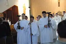 St. Michael's Abbey accepts members who are between the ages of 18 and 29. The initial four years are spent in the monastery, studying the required novitiate courses followed by a three-year cycle in Thomistic philosophy, after which the seminarians are sent to study at St Philip's Seminary[23] in Toronto, Canada, under the direction of the fathers of the Toronto Oratory. Upon completion of the three-year course in theology the students are granted the masters in theology degree. During this period or immediately after there is required a one-year apostolic experience. Following solemn profession all are required to have one year in Rome while living at the Norbertine Generalate and pursuing courses in pastoral theology at the Angelicum, the pontifical university under the direction of the Dominican Order. The association between the Abbey and the Angelicum dates back to 1973. At the conclusion of this formation the confreres may then be ordained as deacons and then priests before beginning to serve in the various ministries of the Order.[24]
