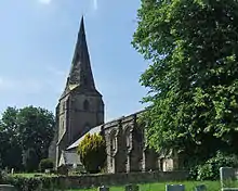 The church is built in sandstone. Its plan consists of a four bay nave which widens to the east, aisles to the north and south, a three bay chancel with north and south chapels, and a tower protruding from the southwest corner.[5] There is a contrast of styles between the chancel and the chapels, which are Perpendicular in style, and the nave, which is mainly Early Decorated.[4][6] Part of the south arcade survives from the Norman church and the north arcade is a copy of this.[7] The tower has deep buttresses, the western two of which are diagonal. On the northern side is a rectangular stair turret. On the west face is a window of two lights and at the second stage is a lancet window. The two-light bell openings are louvred. At the summit is a splay spire with lucarnes.[1] From masons' marks, the lower parts of the tower date from the very early 14th century while the "ringing loft" dates from the middle of that century. The door to the outside of the tower was blocked in the 18th century, when a new door was cut within the church, but was re-opened in 1847. The tower had been rebuilt in 1805 after being struck by lightning. The last work of any significance was carried out in 1905.[8]