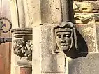 Clockwise from top left: detail of entrance and tower, east window, foliate capital, former school, church hall, and entrance carvings