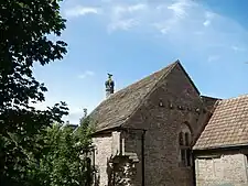 St Briavels Castle is located on a spur dominating a position above the River Wye, on the western edge of the Forest of Dean.[1] The castle is predominantly built of local old red sandstone and limestone.[2] The castle site is surrounded by an in-filled moat; now a garden, the moat was originally wet and fed by a spring underneath the moat itself.[3]