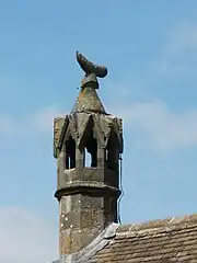 The keep was protected by the stone curtain wall that still survives today, forming the castle bailey.[7] Its irregular polygonal plan suggests that it was built on the site of an earlier earthwork.[5] It originally had a small round tower protecting the south-east corner and probably a gateway in the south wall alongside the keep.[7] Other demolished buildings included a forge and assorted buildings along the north-east of the bailey.[8] A set of medieval domestic buildings still stand along the north-west side of the bailey, however, including a hall, solar and chapel, originally providing accommodation for the castle constable and the King.[8] These buildings were restored in the 19th century to their current condition.[8] Some features, including the hall range, fireplace and capitals appear to date from the 13th century.[5] The hall and solar form a two-storey building 23 m by 10 m (75 ft by 33 ft) wide, alongside the 14th century chapel, which still incorporates later 17th century adjustments and windows.[9] At one end of the domestic range is the famous "Forester's Horn" chimney, crested with the forest warden's horn, a symbol of Forest Law and the castle's authority.[10] The buildings include a sunken pit prison; graffiti dated 1671 show that it was still in use for that purpose at that time.[11]