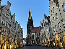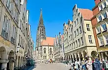 St Lambert's Church (German: St. Lamberti) is a Roman Catholic church building in Münster (Westphalia) in Germany, dedicated to Lambert of Maastricht.[1][2] Its present building is the most significant example of Westphalian late Gothic architecture. It lies on the north side of the Prinzipalmarkt (main market square) in the city centre. Until the early 20th century, the Roggenmarkt (which also borders the church) contained the Drubbels district of housing. To the church's east lies the Alte Fischmarkt and the Salzstraße, whilst between the church and the Salzstraße is the Lambertikirchplatz with the Lambertibrunnen.