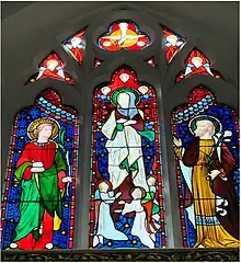 The saints below are (left to right) St Baldwin (a Benedictine reformer), St James, St Mary, St Henry and St Anne. These last four Saints are name saints of members of the Jump family buried outside near to the church porch. The inscription reads "Donante Jacob Jump luceo deo in domo" which translates as Dontate by James Jump to bring light to God’s house.