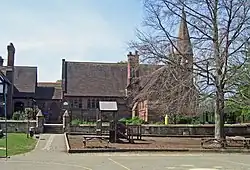 The architectural style is described by Douglas' biographer, Edward Hubbard, as being Gothic,[3] although in the citation in The National Heritage List for England it is described as being as Tudor.[1] It is constructed in red sandstone with a red tile roof and its plan is a 'T'-shape. The school is attached to the former schoolmaster's house, also designed by Douglas, and also a Grade II* listed building.[4] Attached to the other end of the school is an octagonal turret with a belfry and a steeple. The gables have stone coping and shaped finials. At the apex of the front gable is a niche containing the statue of a figure wearing a crown, teaching a child. The windows are mullioned; some of them are arched, while others are straight-headed. There are two arched doorways; the doors have elaborate wrought iron hinges.[1]