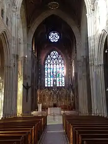 The Cathedra throne projected in three divisions at the second bay on the North side with canopied niches, having crockets and pinnacles and surmounted by a marble spire. The centre of the throne was carved with the arms of the cardinal in statuary marble. The entire crossing was paved with inlaid marbles, designed in squares with quatrefoil panels and crosses and centred on a pietra dura representation of the Cardinal's armorial bearings.