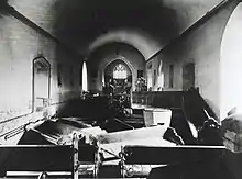 The church is too low-lying to prevent winter floods from entering the building, and brass plates near the chancel arch record the heights of notable floods.[3] A new balcony has been constructed at the back of the church so that perishable items can be kept above the floodline. This balcony is decorated with a beautiful oak screen.[3] The church had a rectory, which was later known as Dixton Cottage.