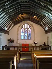 Today the King's Gate is maintained by the City of Winchester, while the duty of maintaining the church falls upon the parish of St Lawrence with St Swithun-upon-Kingsgate.[6] The east window has some fragments of medieval stained glass, most likely depicting the Annunciation, which were brought in 1961 from St Peter's Church, Chesil.[7] Entry to the church is via a narrow staircase, dating from the 1500s, accessible from St Swithun Street next to the right-hand arch of the three arches of the King's Gate.[7]