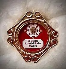 On December 1, 2016, his beatification received approval from Pope Francis who confirmed that Rother had been killed "in odium fidei" ("in hatred of the faith"). Rother was beatified on September 23, 2017, at the Cox Convention Center, with Cardinal Angelo Amato, prefect of the CCS, presiding on the pope's behalf. The beatification Mass was attended by 20,000 people.[12][13][1] Among the bishops who assisted Amato were the Paul S. Coakley, Archbishop of Oklahoma City, and Oklahoma City Archbishop Emeritus Eusebius J. Beltran, who initiated Rother's cause in 2007.[12]