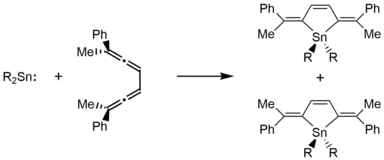 Although stannylenes are more stable than its lighter carbene analogs, they readily undergo [2+4] cycloaddition reaction with Z-alkenes. The addition of (CH(SiMe3)2)2Sn, to 2,7-diphenylocta-2,3,5,6-tetraene proceeds in a cheletropic fashion, as allowed by Woodward-Hoffmann rules.[14]