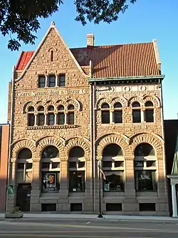 State Savings Loan and Trust is a historic bank building located at 428 Maine Street in Quincy, Illinois. The bank was built in 1892 for brothers Lorenzo and Charles H. Bull, who were prominent Quincy businessmen and community leaders. Chicago architectural firm Patton & Fisher designed the bank in the Richardsonian Romanesque style; local architect Ernest M. Wood designed an addition for the building in 1906. The building has a five-bay facade, with three bays on the original portion and two on the addition; the bays are each marked by a window with a thick stone arch. The original section is topped by a large front-facing gable, providing for attic space above the second story.[2]