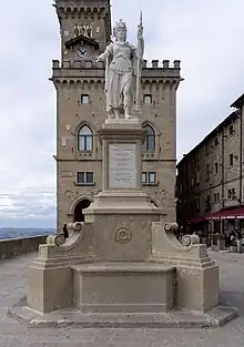 The Statua della Libertà, made in the neoclassical style of white Carrara marble and is located between Parva Domus and the Palazzo Pubblico. It is a work of the sculptor Stefano Galletti and was donated by Countess Otilia Heyroth Wagener from Berlin to the Republic in 1876,[1] because she had become Countess of Acquaviva.