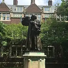 George Whitefield was an evangelist active in the Methodist movement of the mid-1700s.[2] During a trip to the Thirteen Colonies between 1739 and 1741, he preached in Philadelphia in a small building that had been built for that purpose.[2] Following Whitefield's sermons, the building would be used by Benjamin Franklin as the location for a new institution of higher learning, which would eventually become the University of Pennsylvania.[2] Around 1914, the bicentenary of Whitefield's birth, there was a push to erect a statue in his honor. The previous year, during a meeting in New York City, Methodist members of the university's alumni association discussed the possibility of erecting a statue of Whitefield,[2] and the following year the provost of the University of Pennsylvania gave a speech in his honor that contributed to the movement.[3] In 1914, R. Tait McKenzie, a sculptor and the university's director of physical education, was commissioned for the project,[1] and he began working on a design for the statue by 1917.[2] The statue would be one of several that McKenzie would make for the university, including a statue of Edgar Fahs Smith and one of Franklin.[4][5] In researching Whitefield, McKenzie sought out as many portraits as he could find of the man, traveling to Boston and London in the process.[2] By 1918, the casting for the statue was completed. A dedication was set for the university's Alumni Day,[2] June 15, 1919.[note 1] At the unveiling, Wallace MacMullen, D.D. gave a speech that chronicled Whitefield's life and his contributions to evangelism,[6] while a choir played the hymn "For Famous Men", which included verses that honored Whitefield.[3] The monument was a whole gift from the Methodist Alumni Committee to the university.[1]