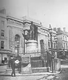 The statue was originally erected on the site of the Old Cross, a two storey building (a meeting hall over an open space), built in 1703 and demolished in August 1784. It stood outside the Market Hall (opened adjacent to it in 1835). Since 25 April 1952 it has had Grade II* listed status.[1]