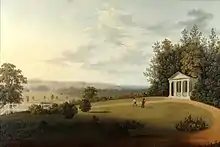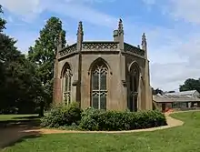 The temple was a memorial commissioned by George Staunton in 1824 with a large memorial urn at its centre.[22] As initially completed the temple contained dedications to Staunton's parents and further dedications to more distant relations and friends.[22] In the following years an eight busts were added in a semi circle around the urn.[23] Most of the busts were of friends of Staunton who had died after 1820 but one was of the then still living William Howley.[23] In 1840 Staunton decided to add no further memorials to the temple.[24] Further busts were added after this time but they were primarily of people still living.[25] The temple was removed when William Henry Stone had his new home constructed on its site.[26]