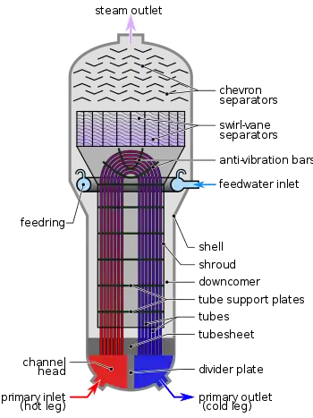 A steam generator (aka nuclear steam raising plant ('NSRP')) is a heat exchanger used to convert water into steam from heat produced in a nuclear reactor core. They are used in pressurized water reactor between the primary and secondary coolant loops.