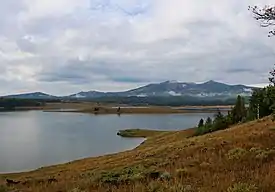 Steamboat Lake State Park is a Colorado state park located in Routt County 27 miles (43 km) north of Steamboat Springs, Colorado, and near the community of Hahns Peak Village. The 2,820-acre (1,140 ha) park land west of Hahns Peak was acquired in 1966.[2] It and the 1,101 acres (446 ha) reservoir was opened to the public in 1972.[3][2] As of 2021 park facilities include a visitors center, marina,[2] boat ramps, campsites, cabins, picnic sites and 5.5 miles (8.9 km) of hiking trails. Plant communities include sagebrush shrubland, quaking aspen and lodgepole pine forests, willow carr and marsh. Commonly seen mammalian wildlife species include mule deer and red fox. The reservoir attracts many species of shorebirds and waterfowl, including sandhill cranes that nest in the wetland areas.