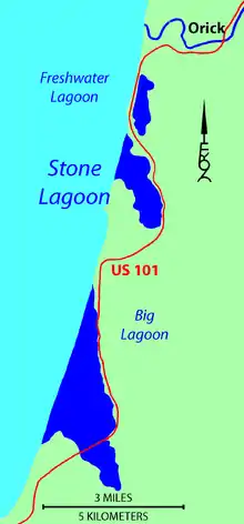 The lagoons are shallow bays between rocky headlands where coastal wave action has formed a sandy bar separating each lagoon from the Pacific Ocean. The lagoons are resting areas for migratory waterfowl using the Pacific Flyway between Lake Earl on the Smith River estuarine wetlands 40 miles (64 km) to the north and Humboldt Bay on the Mad River estuarine wetlands 30 miles (48 km) to the south.