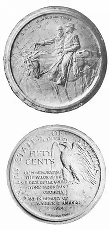 Borglum later stated that the Association asked him to write to people in Washington because of his contacts in the Republican Coolidge administration.[14] He wrote to the powerful Republican Massachusetts senator, Henry Cabot Lodge, urging him to support legislation for a Stone Mountain commemorative coin; the appeal apparently worked, as late in 1923 the committee chairmen having jurisdiction over coinage, Reed Smoot in the Senate and Louis Thomas McFadden in the House of Representatives, introduced legislation for a Stone Mountain Memorial half dollar. McFadden later wrote that he sponsored the legislation because of his friendship with Borglum. With the threat of sectional opposition if the coin only honored the South, the bill's sponsors included language making the new half dollar also in memory of the recently deceased Harding (an Ohioan), during whose presidency the renewed work had begun. The bill passed by unanimous consent in the House on March 6, 1924, and in the Senate five days later; Coolidge signed it on March 17.[15][16] The bill authorizing the coin read: