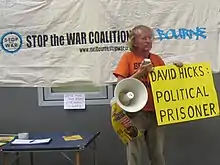 StWC were among many groups campaigning against the incarceration of former Australian Guantánamo detainees, David Hicks[8] and Mamdouh Habib,[9] who were held without trial by the US, as well as supporting the campaigns for Joseph "Jack" Thomas who was the first Australian charged under the Anti-Terrorism Laws and Dr Mohamed Haneef, an Indian doctor charged over a collapsed terrorism plot in the UK, subsequently having his Australian working visa cancelled by former Minister for Immigration, Kevin Andrews.[10] StWC accuse the Australian Government of leading "anti-Arabic racism" and "anti-Muslim attacks", which they argue are a pretext for these case examples. After the Cronulla race riots of 2005, StWC convener Pip Hinman likened the political climate to that of the anti-Asian racism during the period of the White Australia Policy, blaming the Government for the riots and accusing them of overshadowing the Right Wing political platform of the former One Nation leader, Pauline Hanson, in the 1990s.[11]