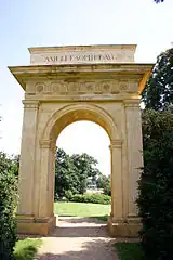 Built of stone erected in 1768 for the visit of Princess Amelia, probably to the design of Thomas Pitt, 1st Baron Camelford, is a simple arch flanked by fluted Doric pilasters, with an elaborate entablature with triglyphs and carved metopes supporting a tall attic. This leads to the Elysian fields.[59]