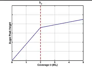 Analytical techniques such as Auger electron spectroscopy (AES), low-energy electron diffraction (LEED), and reflection high energy electron diffraction (RHEED), have been extensively used to monitor SK growth. AES data obtained in situ during film growth in a number model systems, such as Pd/W(100), Pb/Cu(110), Ag/W(110), and Ag/Fe(110), show characteristic segmented curves like those presented in figure 4.[1][2][11] Height of the film Auger peaks plotted as a function of surface coverage Θ, initially exhibits a straight line, which is indicative of AES data for FM growth. There is a clear break point at a critical adsorbate surface coverage followed by another linear segment at a reduced slope. The paired break point and shallow line slope is characteristic of island nucleation; a similar plot for FM growth would exhibit many such line and break pairs while a plot of the VW mode would be a single line of low slope. In some systems, reorganization of the 2D wetting layer results in decreasing AES peaks with increasing adsorbate coverage.[11] Such situations arise when many adatoms are required to reach a critical nucleus size on the surface and at nucleation the resulting adsorbed layer constitutes a significant fraction of a monolayer. After nucleation, metastable adatoms on the surface are incorporated into the nuclei, causing the Auger signal to fall. This phenomenon is particularly evident for deposits on a molybdenum substrate.