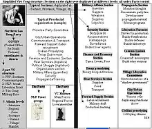 Guerrilla warfare resembles rebellion, yet it is a different concept. Guerrilla organization ranges from small, local rebel groups of a few dozen guerrillas, to thousands of fighters, deploying from cells to regiments. In most cases, the leaders have clear political aims for the warfare they wage. Typically, the organization has political and military wings, to allow the political leaders "plausible denial" for military attacks.[10] The most fully elaborated guerrilla warfare structure is by the Chinese and Vietnamese communists during the revolutionary wars of East and Southeast Asia.[11] A simplified example of this more sophisticated organizational type – used by revolutionary forces during the Vietnam War, is shown above.