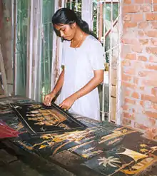 The grass is first hand-dyed. Before European contact, exclusively natural dyes were used and the straw was soaked in aguamiel or agave juice.[9] Then the artist draws a design, which is then covered by a fine layer of "cera de Campeche," a special type of beeswax. The straw is then cut down to workable sizes, sometimes as fine as a single millimeter in length. The artist then carefully presses the pieces of straw into the beeswax. When the design is finished, a fixative is applied to protect the finished work.[7]