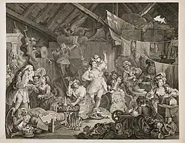 Strolling Actresses Dressing in a Barn is a painting from 1738 by British artist William Hogarth. It was reproduced as an engraving and issued with Four Times of the Day as a five print set in the same year. The painting depicts a company of actresses preparing for their final performance before the troupe is disbanded as a result of the Licensing Act 1737. Brought in as a result of John Gay's Beggar's Opera of 1728, which had linked Robert Walpole with the notorious criminal Jonathan Wild, the Licensing Act made it compulsory for new plays to be approved by the Lord Chamberlain, and, more importantly for the characters depicted, closed any non-patent theatres. The majority of the painting was completed before the Act was passed in 1737, but its passing into law was no surprise and it was the work of a moment for Hogarth to insert a reference to the Act itself into the picture.