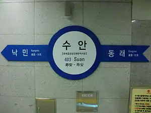 Suan Station (Korean: 수안역; Hanja: 壽安驛) is a station of Busan Metro Line 4 in Suan-dong, Dongnae District, Busan, South Korea.