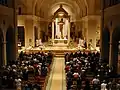 The monks transferred to the Subiaco Abbey site. This building was gutted by fire in 1927 and was rebuilt. The third Abbot of Subiaco, Paul Nahlen, O.S.B., obtained Pope Pius XII's blessing for the construction of the present church on the Abbey campus. The church was completed in 1959.[1] This act is depicted in one of the 182 stained-glass windows in St. Benedict Abbey Church.