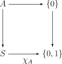 To categorize this notion, recall that, in category theory, a subobject is actually a pair consisting of an object and a monic arrow (interpreted as the inclusion into another object). Accordingly, true refers to the element 1, which is selected by the arrow: true: {0} → {0, 1} that maps 0 to 1. The subset A of S can now be defined as the pullback of true along the characteristic function χA, shown on the following diagram: