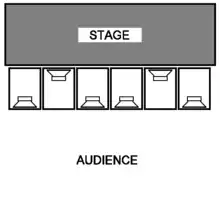 During the 1940s swing era, to get deeper bass, "pipelike opening[s]" were cut into speaker enclosures, creating bass reflex enclosures, as it was found that even a fairly inexpensive speaker enclosure, once modified in this way, could "transmit the driving power of a heavy...drumbeat—and sometimes not much else—to a crowded dancefloor."[9] Prior to the development of the first subwoofers, woofers were used to reproduce bass frequencies, usually with a crossover point set at 500 Hz and a 4-inch (10 cm) loudspeaker in an infinite baffle or in professional sound applications, a "hybrid horn-loaded" bass reflex enclosure (such as the 15-inch Altec Lansing A-7 enclosure nicknamed the "Voice of the Theater", which was introduced in 1946).[11] In the mid-1950s, the Academy of Motion Picture Arts and Sciences selected the "big, boxy" Altec A-7 as the industry standard for movie sound reproduction in theaters.[12]