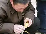 To start, the artist heats the sugar syrup they are using (usually sucrose and maltose) to at least 170 degrees.[6] Next, the artist pulls off a section and uses his or her hands to knead it into a ball.[7] A thin straw is then inserted into the ball, and the artist begins to blow air into it, in order to slowly inflate it. Simultaneously, the artist pinches and pulls parts of the ball, by hand, or sometimes with tools such as tweezers, to produce limbs, and various shapes. Before the figure has completely cooled, colours, typically red or green, are added to the surface, and a wooden stick is inserted into the underside. The straw is then extracted, and the figure put on display for sale.