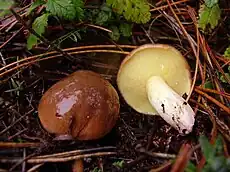 Suillus collinitus is a pored mushroom of the genus Suillus in the family Suillaceae. It is an edible mushroom found in European pine forests. The mushroom has a reddish to chestnut-brown cap that reaches up to 11 cm (4.3 in) in diameter, and a yellow stem measuring up to 7 cm (2.8 in) tall by 1 to 2 cm (0.4 to 0.8 in) thick. On the underside of the cap are small angular pores, initially bright yellow before turning greenish-brown with age. A characteristic feature that helps to distinguish it from similar Suillus species, such as S. granulatus, is the pinkish mycelia at the base of the stem.