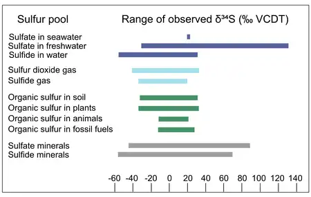 Sulfur in natural materials can vary widely in isotopic composition: compilations of the δ34S values of natural sulfur-containing materials include values ranging from −55‰ to 135‰ VCDT.[27] The ranges of δ34S values vary across sulfur-containing materials: for example, the sulfur in animal tissue ranges from ~ −10 to +20‰ VCDT, while the sulfate in natural waters ranges from ~ −20 to +135‰ VCDT.[27] The range of sulfur isotope abundances in different natural materials results from the isotope fractionation associated with natural processes like the formation and modification of those materials, discussed in the next section.