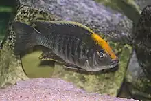 The sulfurhead aulonocara (Aulonocara maylandi) or sulfurhead peacock is a species of haplochromine cichlid which is endemic to Lake Malawi in the country of Malawi and has only been observed on West Reef (Luwala Reef) and Eccles Reef (Chimwalani Reef).[1] It is threatened by collection for the aquarium trade and this has caused a 70% reduction in numbers.[1] In this mouthbrooding species, the eggs are cared for by the females only, and it is found over mixed sand and rocky areas where they hunt small invertebrates in the sand.[2] It closely resembles the blue orchid aulonocara (Aulonocara kandeense) though it develops a yellow blaze across its dorsal In the past these two taxa have been considered to be subspecies.[3] The specific name honours Hans-Joachim Mayland, an author on cichlids and a fishkeeper, brought the species to the attention of Ethelwynn Trewavas.[4]