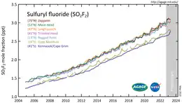 - ↑ Papadimitriou, V.C., R.W. Portmann, D.W. Fahey, J. Mühle, R.F. Weiss, and J.B. Burkholder, Experimental and Theoretical Study of the Atmospheric Chemistry and Global Warming Potential of SO2F2, Journal of Physical Chemistry A, 112 (49), 12657-12666, doi:10.1021/jp806368u, 2008.