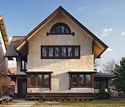 While other houses continued to draw inspiration from history a comparatively more modern style also took root on Summit Avenue, the Rectilinear Style. In this style, the architectural form moves away from previous irregular and fantastical forms and towards a more rectangular shape.[13] Houses of this style often feature elements such as overhanging eaves and casement windows but have little applied ornamentation and are relatively unpretentious when compared to other styles.[13] The Dittenhofer house at 705 Summit exhibits a move towards the Rectilinear style in its symmetry and blockish shape but cannot escape historicism in its medieval-inspired elements such as Gothic-like arched windows that were once fitted with stained glass.[13] The 1912 Beebe House in comparison is much simpler and thoroughly unpretentious in its appearance, looking almost insignificant compared to the other grand houses on the avenue. The Beebe House features no ornamentation but includes extended eaves and windows arranged in banked groups, elements also distinctive of the famous Prairie Style which was soon to become a variant of the Rectilinear.[13]