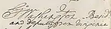 Signature of George Washington on the United States Constitution with superior letters, reading Go. Washington—Presidt. and deputy from Virginia.