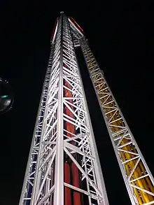 Superman: Tower of Power is a drop tower ride currently located at two Six Flags parks,[1] and two former installments at Kentucky Kingdom and Six Flags St. Louis. Two of the four drop towers were manufactured by Intamin, while the Six Flags Over Georgia version was made by Zamperla, and the Six Flags Over Texas version was made by S&S. The installment at Kentucky Kingdom (then known as Six Flags Kentucky Kingdom) was demolished after an accident that severed a 13-year-old girl's feet. At Six Flags St. Louis, the ride was removed from the park's website in early 2021.[2][3] Three additional drop towers of the same model by S&S are installed at other Six Flags parks Six Flags New England and Six Flags Fiesta Texas, each known as Scream and one more built at Six Flags Great Escape and Hurricane Harbor known as Sasquatch.