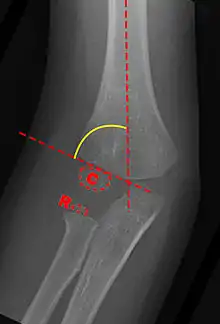 Carrying angle can be evaluated through AP view of the elbow by looking at the Baumann's angle.[3] There are two definitions of Bowmann's angle: