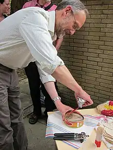 Swedes usually consume surströmming after the third Thursday of August, labeled as "Surströmming day", through early September.[20] Because of the strong smell, it is often eaten outdoors. The pressurized can is usually opened some distance away from the dining table and is often initially punctured while immersed in a bucket of water, or after tapping and angling it upwards at 45 degrees, to prevent escaping gas from spraying brine.