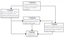 While the creation of sustainability frameworks and measurements to improve the communication between businesses and shareholders is valuable, there is still room for improvement.[26] To help address this need, a new form of sustainability accounting known as Context-Based Sustainability (CBS) has been in development since 2005.[27][28] Contrary to many other approaches to the subject, which tend to be purely incrementalist in form (i.e., they measure impacts on resources in terms of more of one type of impact this year, or less of another), CBS assesses impacts relative to sustainability standards of performance that are specific to individual organizations and explicitly tied to resource limits and thresholds in the world (social, environmental and economic). The most recent and fully elaborated implementation of CBS is the MultiCapital Scorecard method, first put forward by its creators in 2013.[29]