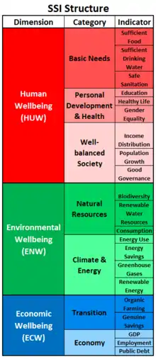 The SSI was developed by the Dutch Sustainable Society Foundation to provide the public at large, as well as politicians and authorities, with a transparent and easy tool to measure how sustainable a society is. The SSI is based on the Brundtland definition, and incorporates 21 indicators. These can be sorted into seven categories and three wellbeing dimensions. In 2020, production and development of SSI was taken over by Technische Hochschule Köln.