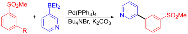 Another example is the coupling of 3-pyridylborane and 1-bromo-3-(methylsulfonyl)benzene that formed an intermediate that was used in the synthesis of a potential central nervous system agent. The coupling reaction to form the intermediate produced 278 kilograms in a 92.5% yield.[15][23]