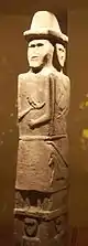 Some scholars see an analogy to Svetovit in an idol from Zbruch, the so-called Sviatovid.[79][80] This statue was found in 1848 from the bottom of the Zbruch River, a tributary of the Dniester. It is a quadrangular limestone pillar, generally dated to the 9th-10th centuries. On the top are four faces facing the four directions of the world. Below, the four sides are covered with reliefs, which are often interpreted as specific deities, which are divided into three levels, which are sometimes interpreted as a cosmological division.[79] However, there are disagreements about the interpretation of the statue,[81] as well as divergent views about its dating, the very belonging to Slavic culture[82] is also subject to criticism.