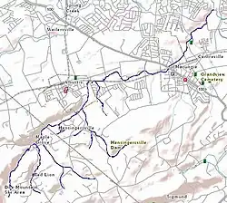 A tributary of the west branch flows past the village of Red Lion and joins the primary branch and another tributary in the village of Maple Grove. The west branch of Swabia Creek then runs along the Lock Ridge south face.[2] The east branch passes through Hensingersville Dam.[3] The east and west branches connect in Hensingersville. Swabia creek then runs north to Alburtis through Lock Ridge Park. The creek turns east, running roughly parallel to railroad tracks.[4][5][6]