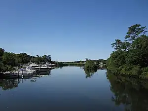 The Swan River is in Suffolk County on Long Island, New York. It flows into Swan Lake[1] from the north, and then south out of the lake into the mouth of Patchogue Bay, which then becomes the Great South Bay. Originally, the headwaters reached as far north as Medford, New York, near the vicinity of the Long Island Rail Road's Medford station.[2] Swan River is a relatively clean, cold, free flowing, freshwater stream, generally less than 15 feet wide, with a sandy substrate. This segment of the river flows through much undeveloped forested wetland, but has also been encroached upon by residential development, road construction, and a commercial sand mining operation. Below Montauk Highway, the river is tidal, and is bordered by undeveloped marshland and limited development of boat docking facilities. The fish and wildlife habitat encompasses the entire river, including an approximate one and one-half mile tidal segment, and an approximate two and one-half mile freshwater segment, which extends from Swan Lake, above Montauk Highway, to the headwaters of the stream, above Swan Lake, flowing southward into Patchogue Bay.